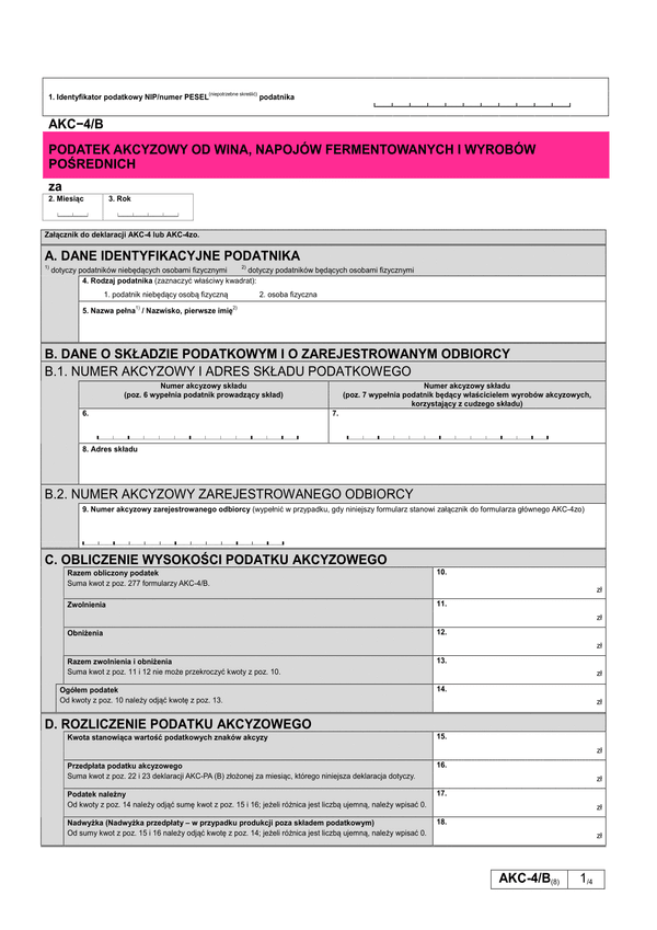 Dla każdego składu podatkowego formularz AKC-4/B należy wypełnić oddzielnie, wpisując w polu 4 formularza kolejno numery: 1, 2, 3 ... (część E należy wypełnić tylko w formularzu nr 1 dla wszystkich składów łącznie). Jeżeli wystąpi konieczność wypełnienia więcej niż jednego formularza AKC-4/B dla tego samego składu, formularze należy oznaczyć odpowiednio numerami: 1, 1a, 1b ...; 2, 2a, 2b ...; 3, 3a, 3b ... . W przypadku złożenia przez podatnika więcej niż jednego formularza AKC-4/B dotyczącego tego samego składu, części C i D wypełnia się tylko w formularzach oznaczonych numerami: 1, 2, 3 ... .