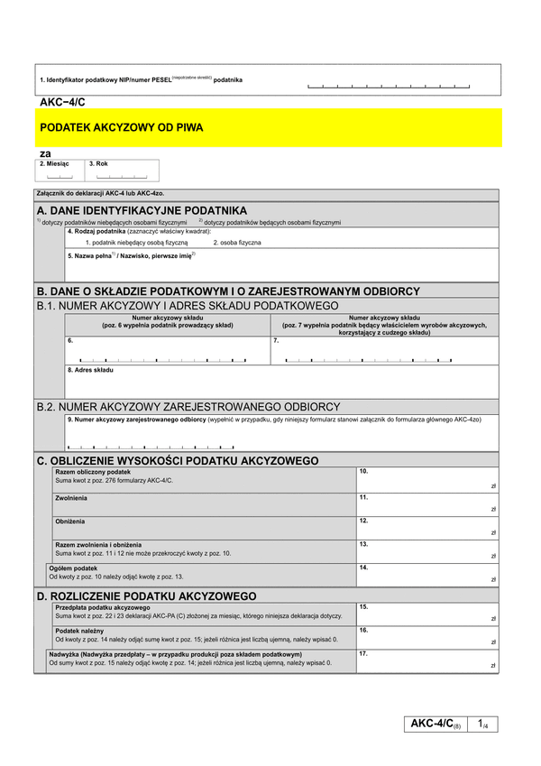 Dla każdego składu podatkowego formularz AKC-4/C należy wypełnić oddzielnie, wpisując w polu 4 formularza kolejno numery: 1, 2, 3 … (część E należy wypełnić tylko w formularzu nr 1 dla wszystkich składów łącznie). Jeżeli wystąpi konieczność wypełnienia więcej niż jednego formularza AKC-4/C dla tego samego składu, formularze należy oznaczyć odpowiednio numerami: 1, 1a, 1b ...; 2, 2a, 2b ...; 3, 3a, 3b ... . W przypadku złożenia przez podatnika więcej niż jednego formularza AKC-4/C dotyczącego tego samego składu, części C i D wypełnia się tylko w formularzach oznaczonych numerami: 1, 2, 3 ... .