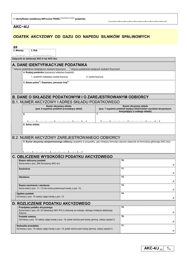 Dla wyrobów gazowych przeznaczonych do napędu silników spalinowych, dla których nie stosuje się procedury zawieszenia poboru akcyzy, wypełnia się oddzielny formularz/formularze AKC-4/J, wpisując w polu 4 formularza kolejno numery 1, 1a, 1b ... .