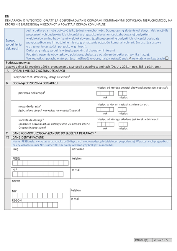 DN Deklaracja o wysokości opłaty za gospodarowanie odpadami komunalnymi dotycząca nieruchomości na której nie zamieszkują mieszkańcy, a powstają odpady komunalne (Warszawa)