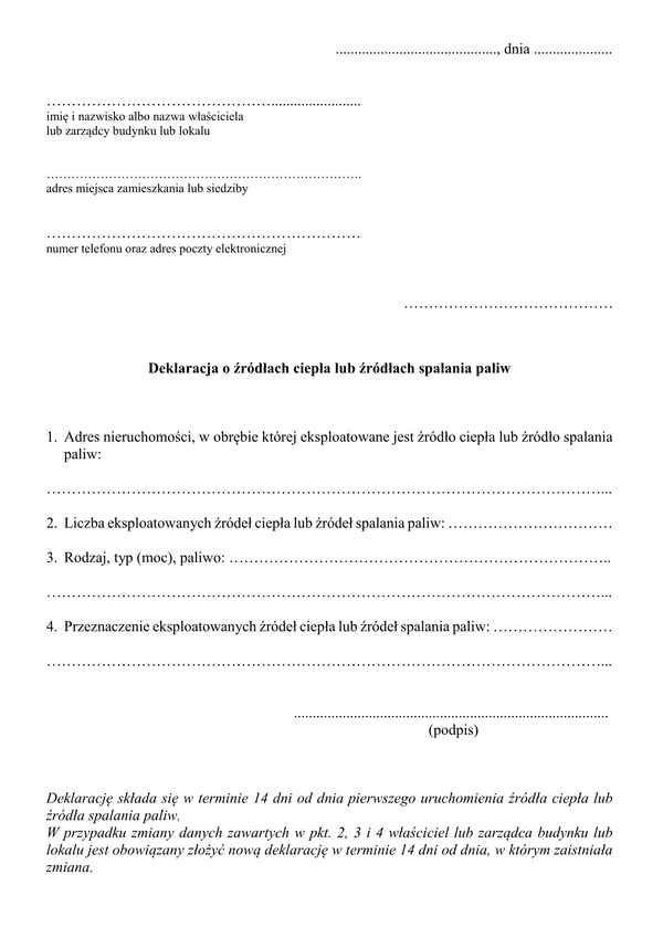 Składanie deklaracji rozpocznie się 1 lipca 2021 r. od tego dnia właściciel/zarządca budynku, który już istnieje ma 12 miesięcy. W przypadku nowego budynku, w którym zostało uruchomione źródło ciepła/spalania paliw termin na złożenie deklaracji wynosi 14 dni.