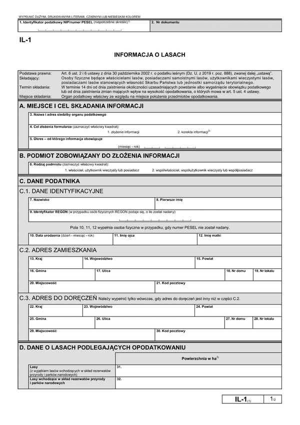Rozporządzenie Ministra Finansów z dnia 3 czerwca 2019 r. w sprawie wzorów informacji o lasach i deklaracji na podatek leśny (Dz.U. 2019 poz. 1126) - załącznik nr 1