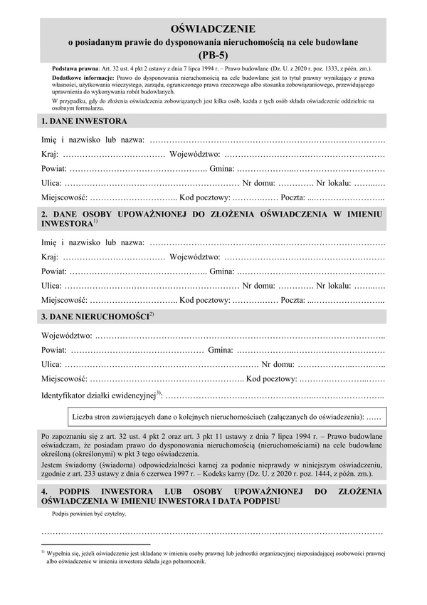 PB-5 Oświadczenie o posiadanym prawie do dysponowania nieruchomością na cele budowlane (PB-5)
