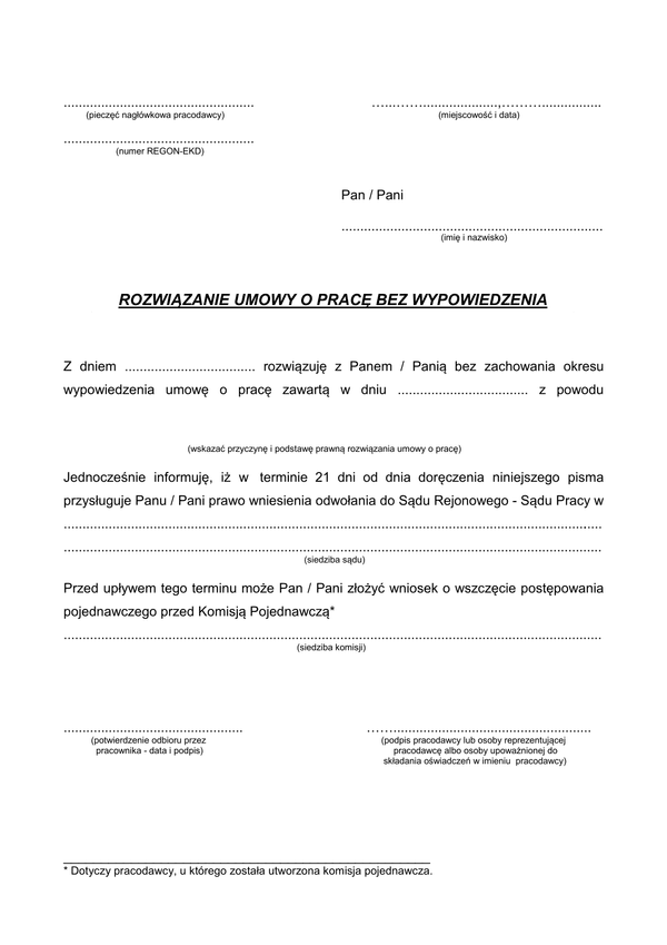 Rozwiązanie umowy o pracę bez wypowiedzenia jest oświadczeniem woli, złożonym przez jedną stronę stosunku pracy, powoduje natychmiastowe ustanie zawartej umowy. Może złożyć ją zarówno pracownik jak i pracodawca w formie pisemnej z podaniem przyczyny uzasadniającej ustanie umowy. Oświadczenie powinno zawierać pouczenie o przysługujących pracownikowi prawach, czyli informację o możliwości złożenia wniosku o przywrócenie do pracy lub odszkodowanie. Taki wniosek powinien zostać złożony w terminie 21 dni od dnia otrzymania oświadczenia o rozwiązaniu umowy.