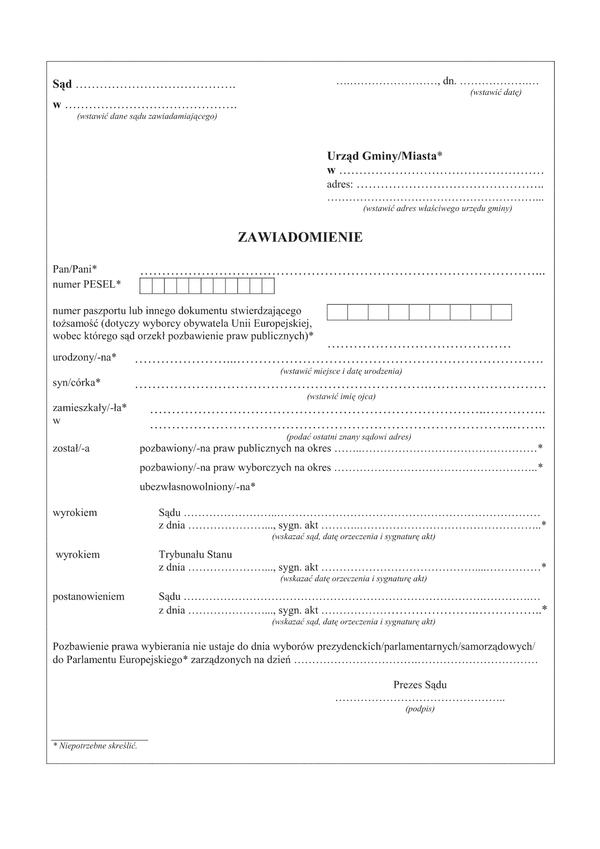 Zawiadomienie o osobach pozbawionych prawa wybierania osoby pozbawione prawo wybór wyboru przekazuje się urzędowi właściwej gminy oraz, odpowiednio, administracji zakładu karnego lub aresztu śledczego nie później niż w trzydziestym dniu przed dniem wyborów.